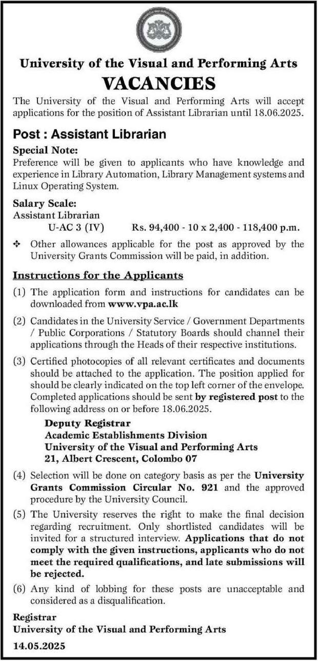 Join our team at the University of the Visual & Performing Arts as an Assistant Librarian! We are seeking a highly organized and detail-oriented individual to assist in the management and maintenance of our library resources. As an Assistant Librarian, you will be responsible for cataloging and classifying materials, assisting patrons with research needs, and providing general support to the library staff. The ideal candidate will have a degree in Library Science or a related field, as well as strong communication and customer service skills. Additionally, experience with library software and databases is preferred. This is a fantastic opportunity to join a prestigious institution and contribute to the academic success of our students and faculty. If you are passionate about library services and eager to join a dynamic team, apply now!