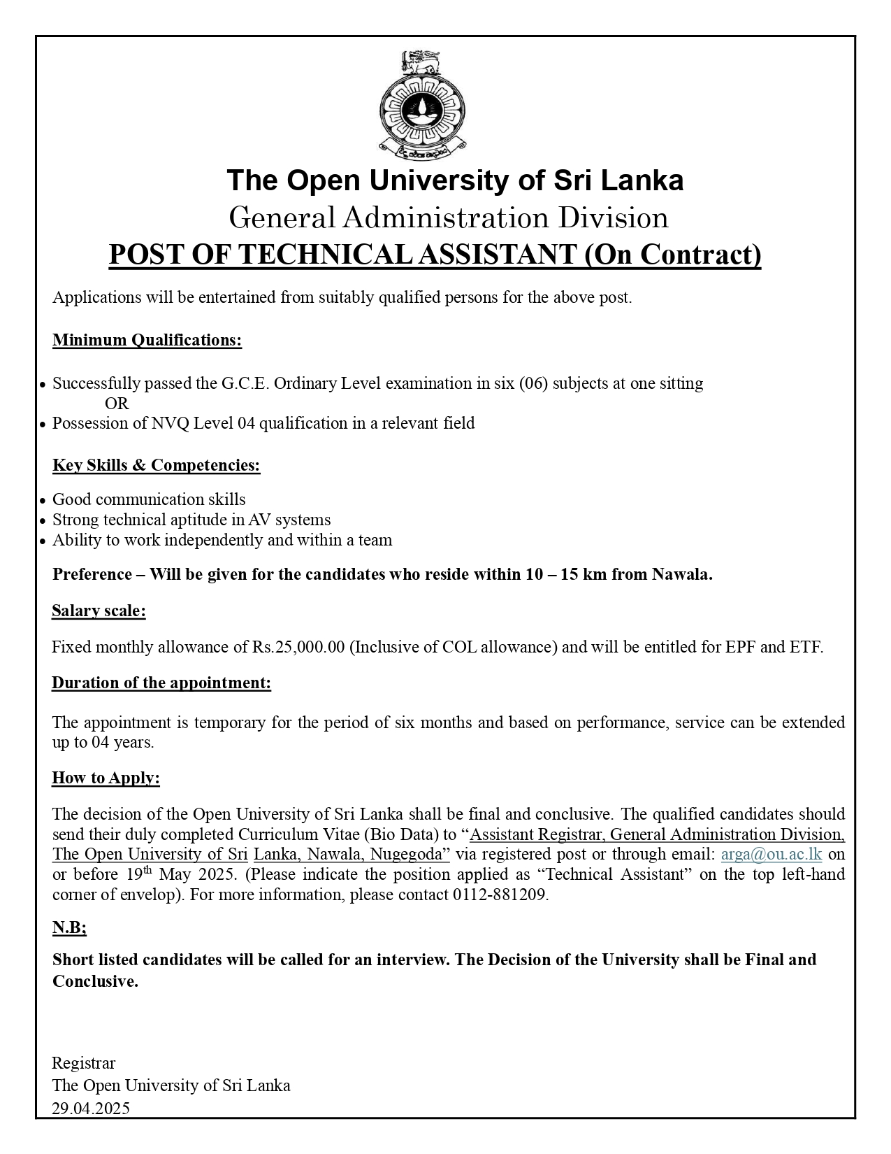 The Open University of Sri Lanka is seeking highly motivated individuals for the position of Technical Assistant. As a leading institution in higher education, we are committed to providing a dynamic and inclusive learning environment for our students. The Technical Assistant will play a crucial role in supporting the academic and administrative functions of the university. The ideal candidate should have a strong technical background and be proficient in various computer applications. Responsibilities include maintaining and troubleshooting technical equipment, providing technical support to faculty and staff, and assisting with the development of new technology initiatives. The successful candidate will have excellent communication and problem-solving skills, as well as a passion for learning and innovation. Join our team and be a part of shaping the future of education in Sri Lanka. Apply now and start your journey with The Open University of Sri Lanka.